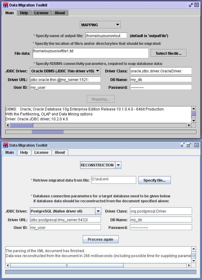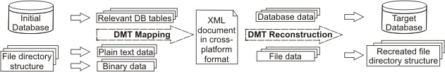 L'outil de migration de données (DMT, Data Migration Toolkit) est un programme - complètement implémenté en Java avec une interface graphique - qui facilite l'échange de fichiers ainsi que de données de bases de données relationnelles entre des plate-formes différentes. Le DMT permet d'une part, la mapping du contenu dans un fichier XML à un format textuel et transfert sécurisé, et d'autre part, la conversion inverse de la migration des données du fichier XML à leur format d'origine en conservant les données d'émission. Comme une application Java, le DMT s'exécute sur n'importe quel système d'exploitation (Linux, Macintosh, Solaris, Windows, etc.) où l'on peut installer et configurer correctement une machine virtuelle Java (de préférence à partir de versions Java 1.3). Pour migrer les données d'une base de données, il faut un pilote JDBC (disponible gratuitement chez la plupart des fournisseurs de base de données). Avant la publication officielle, le DMT a été utilisé avec succès avec les bases de données FirebirdSQL, HSQLDB, MS Access (avec le pilote XMLDBMS 2.0), MySQL, Oracle, PostgreSQL.