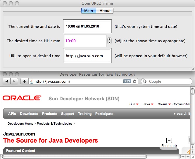 Un de mes amis m'a demandé de créer un outil multi-plate-forme avec une interface graphique qui permettrait l'ouverture d'une URL (comme une adresse Internet ou Intranet) dans un navigateur à une heure déterminée. C'est très utile, lorsque, par exemple, on veut se rappeler de vérifier ses courriels professionnels avant de quitter le bureau, ou bien de ne pas oublier de visiter une page Internet pour y lire les dernières nouvelles.